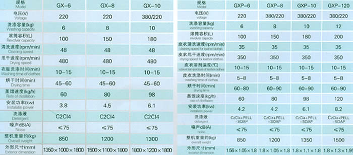 ●电脑控制、全自动。操作简易。洗净率高。●蒸汽或电加热、烘干效果好。●洗涤剂回收率高。●洗涤呢绒、绸缎、化纤、裘皮、羽毛、棉织物等不损伤、不褪色、不皱缩、防虫蛀。●广泛使用于宾馆、酒店、干洗店、医院、工矿企、部队、机场、远洋客轮。技术参数: